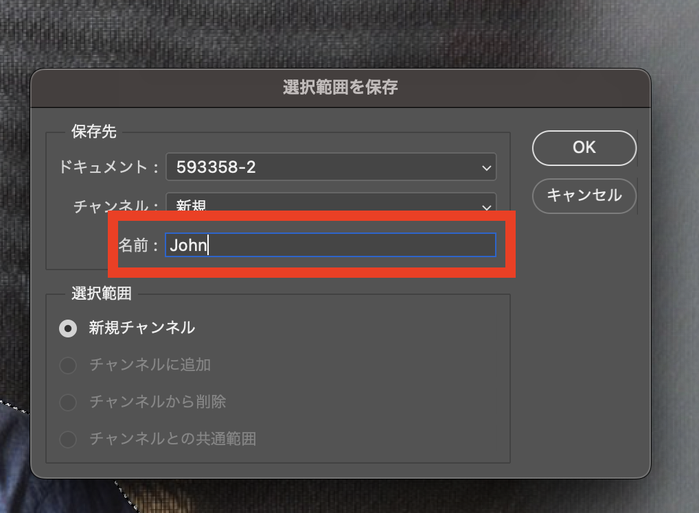 その後、[ウィンドウ]パネルから[チャンネル]をクリックし、画像がチャンネルに保存されていることを確認したらOK。