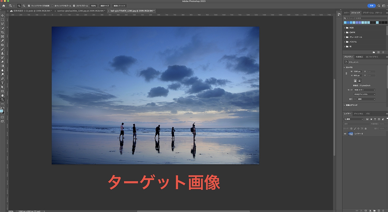 ターゲット画像を選択した状態で、[イメージ] → [色調補正]→[カラーの適用]を選択します。